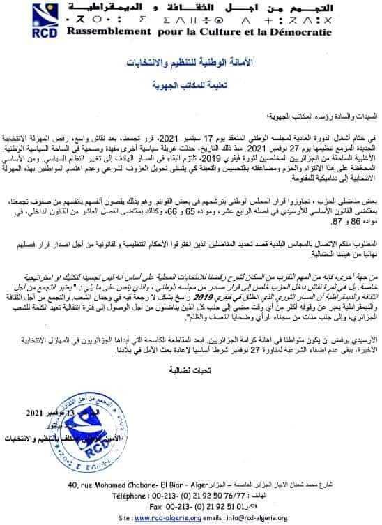 وجهت قيادة حزب التجمع من أجل الثقافة والديمقراطية الأرسيدي مراسلة إلى هياكلها الجهوية تدعوهم فيها لإبعاد المناضلين الذين ترشحوا للانتخابات المحلية من صفوف الحزب.